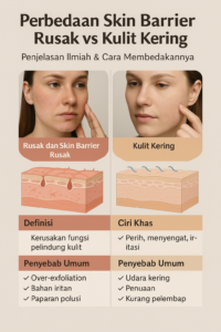 Secara sederhana, kulit kering adalah masalah kelembapan (kuantitas air/minyak), sedangkan skin barrier rusak adalah masalah struktur dan fungsi pertahanan kulit itu sendiri.